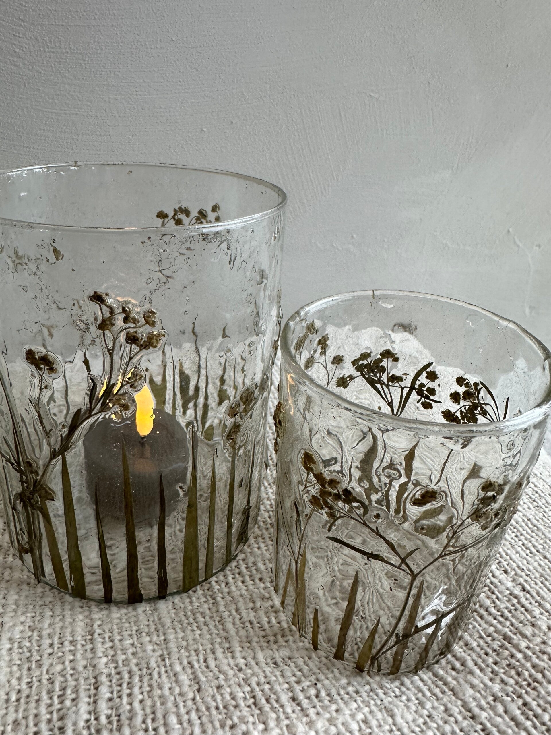 Prachtige windlichtjes met echte gedroogde bloemetjes op/in verwerkt.